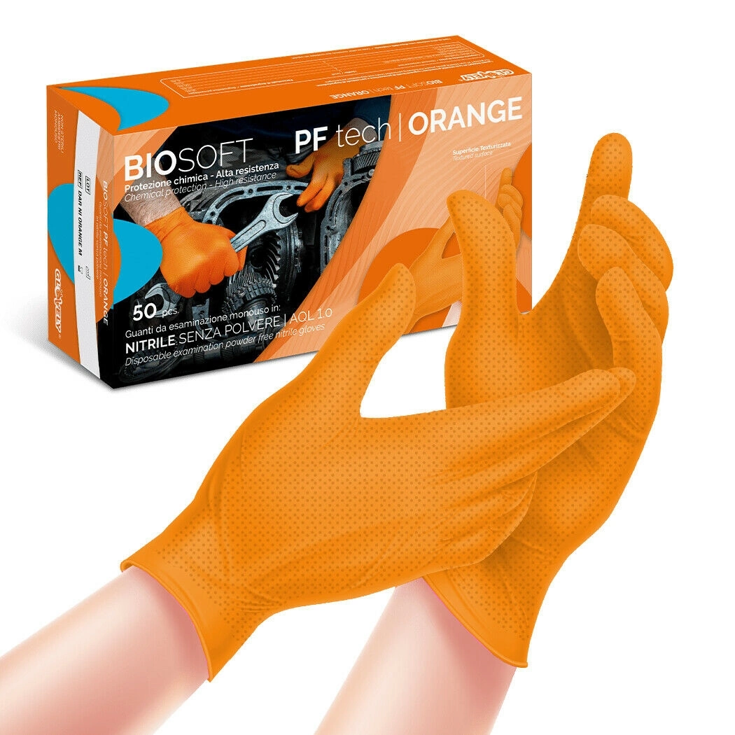 Guanto non sterile in nitrile arancione, privo di lattice, senza polvere, con superficie testurizzata a diamante.